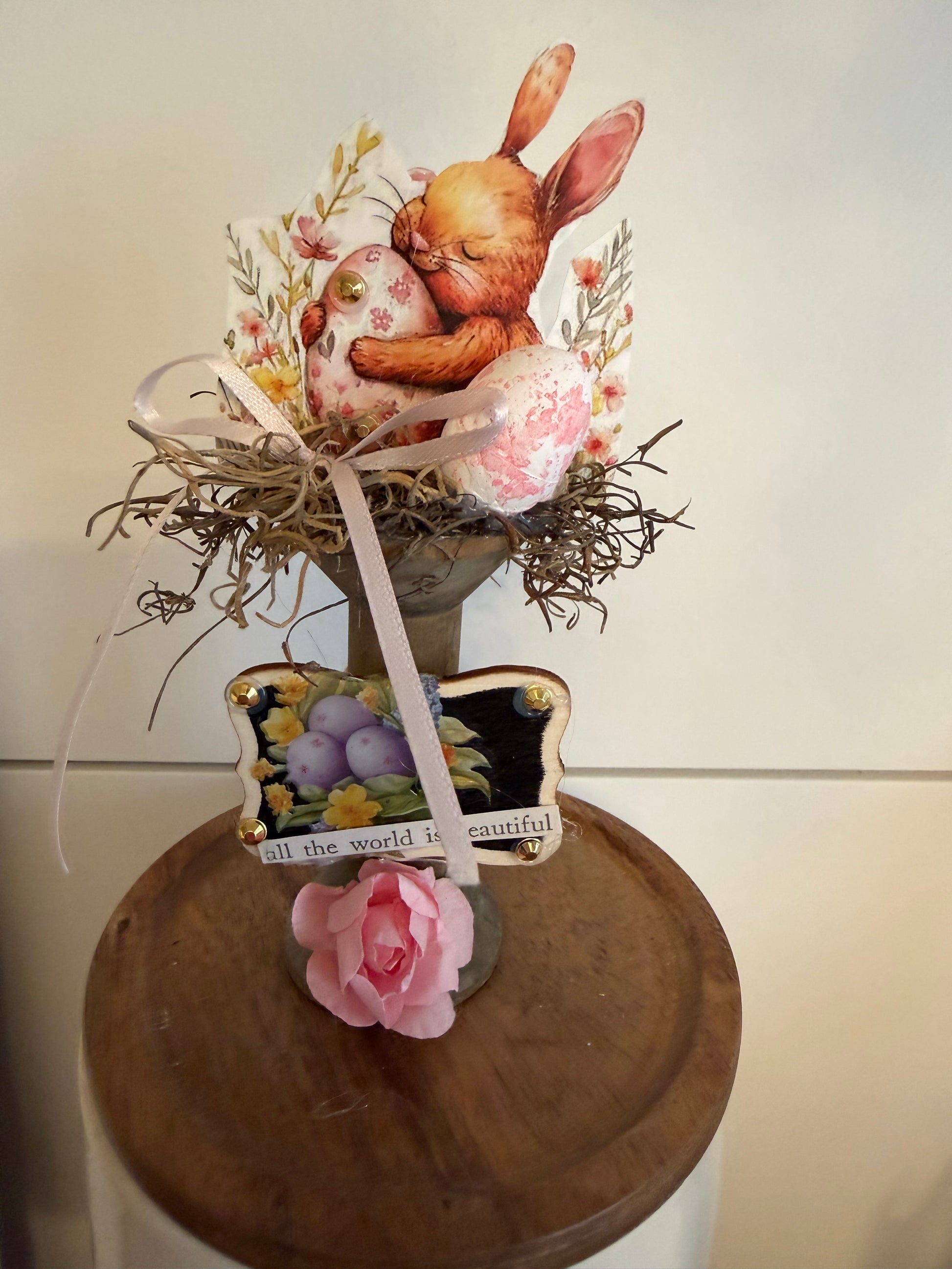 Sweet rabbit holding an Easter egg with wild flowers in the background on card stock on a wooden spool with lace, has a sweet shoestring type pink bow and paper sweetheart roses and a chalkboard sign with a rub-on of bundle of eggs with a message that reads "all the world is beautiful"
