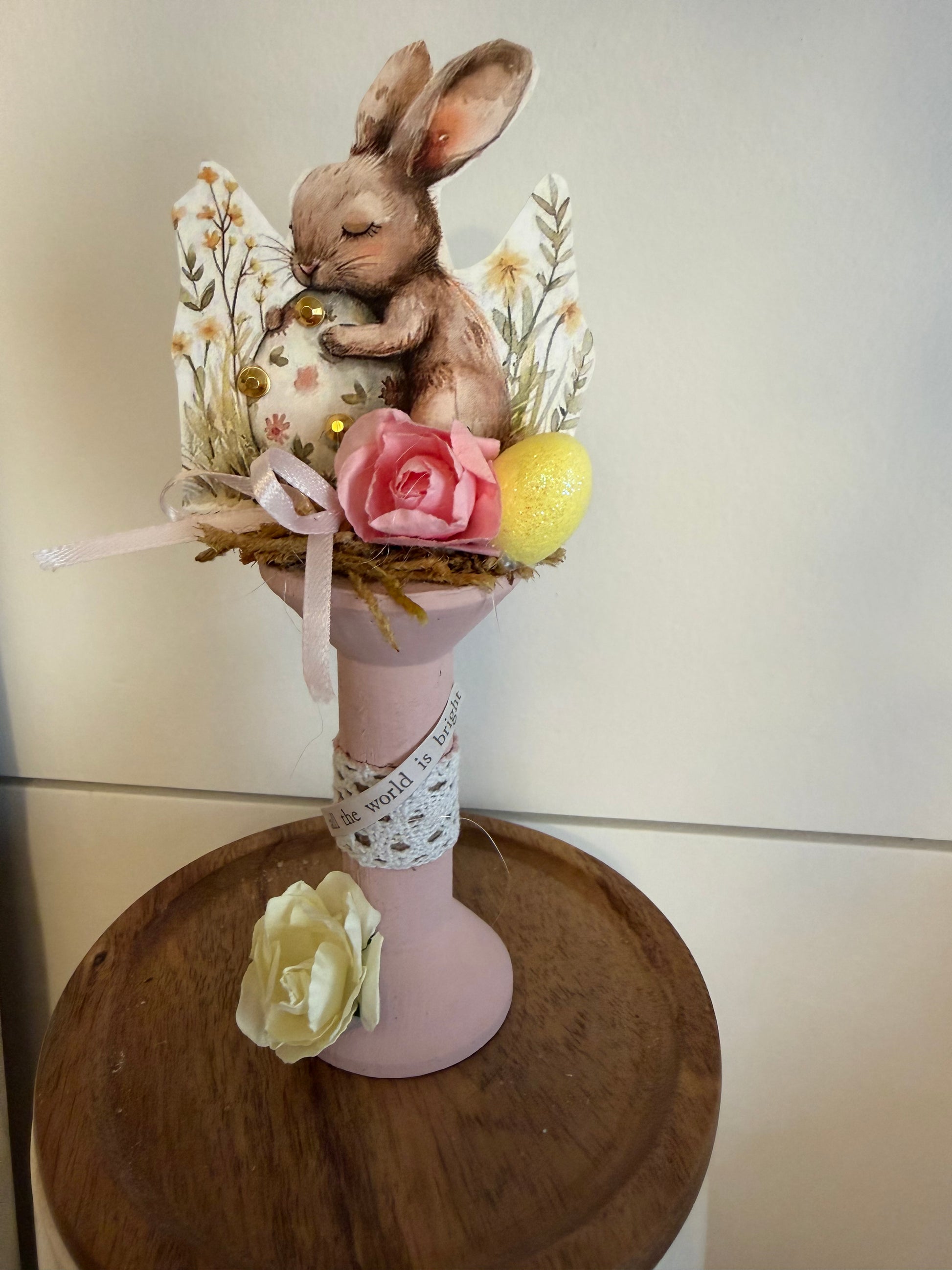 Sweet little rabbit holing an Easter egg on card stock on a wooden spool with lace and pink sweetheart rose with a yellow egg and cream sweetheart rose on base along with the "all the world is bright"