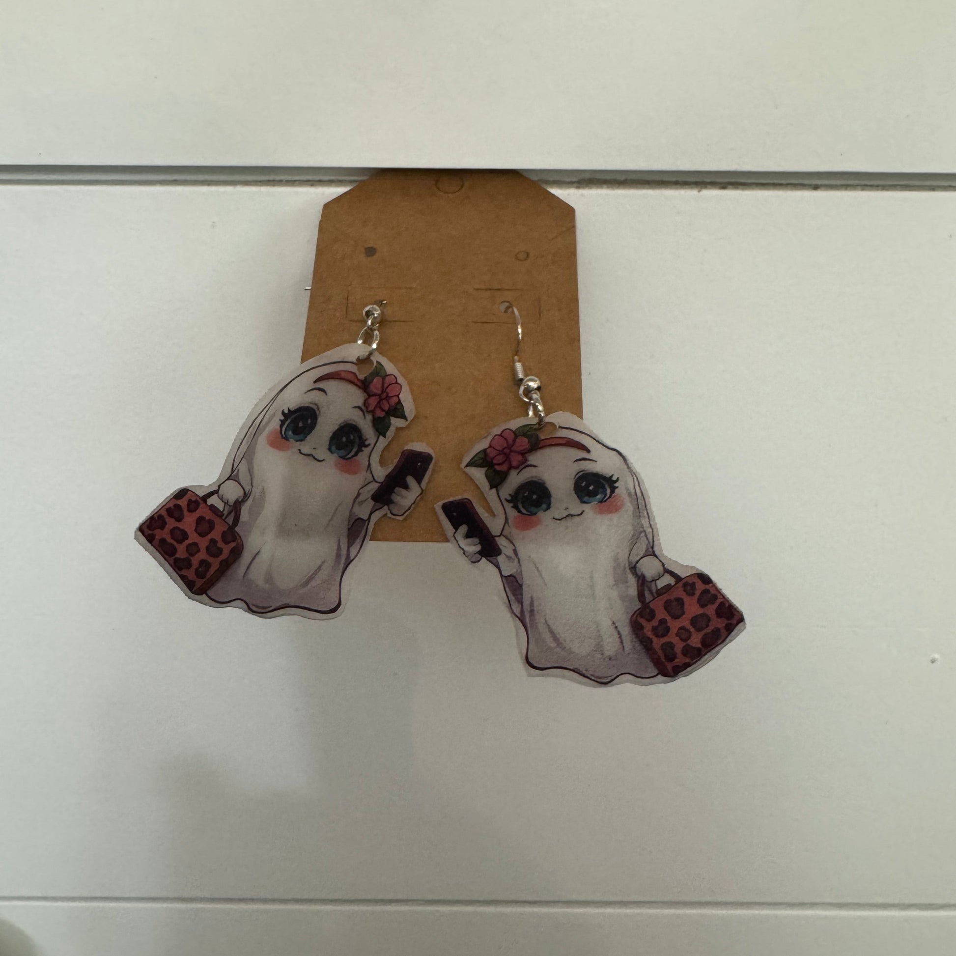 Hanging Boo Jee ghost with leopard print purse and cell phone