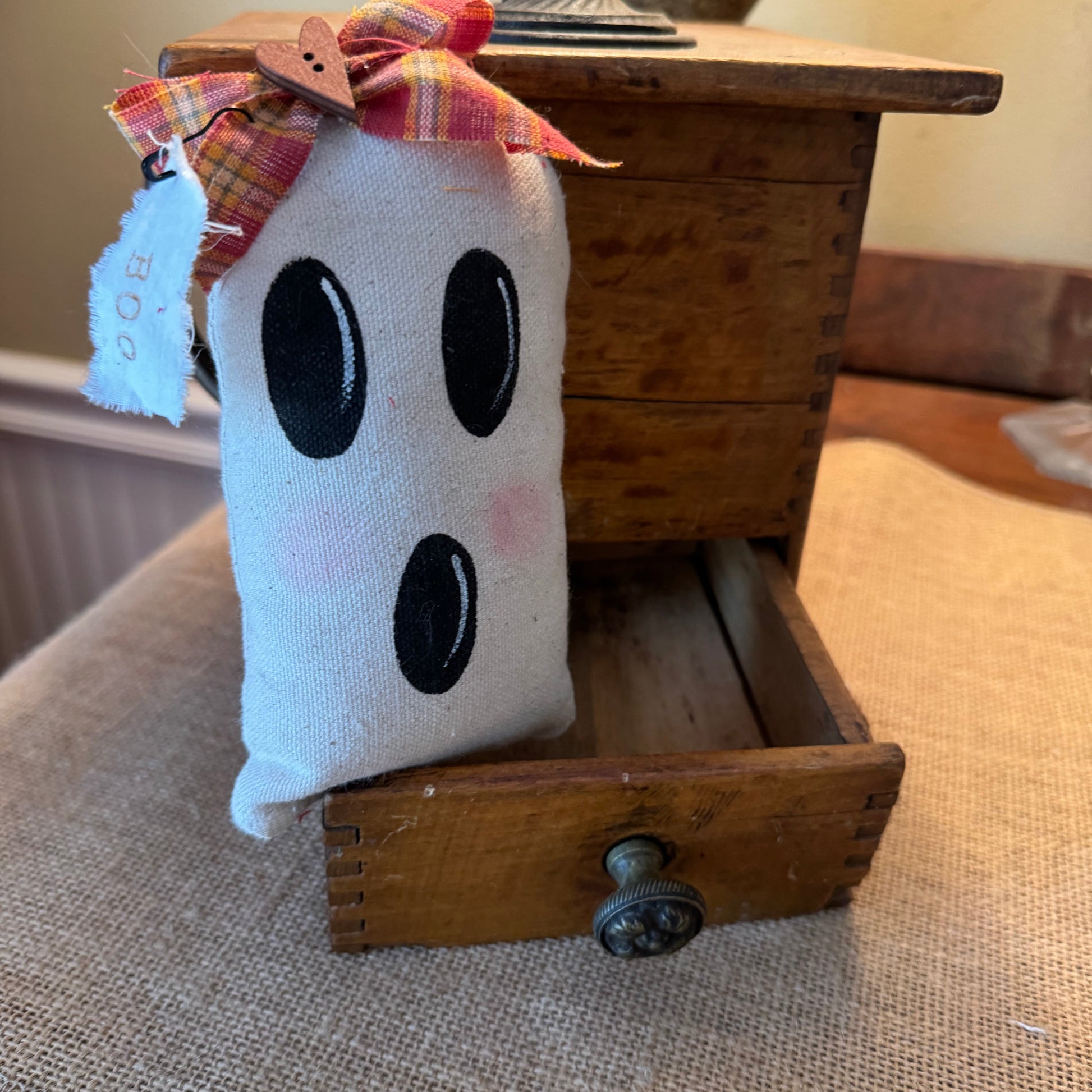 This sweet 5H X 3W ghost is handmade with love from soft white fabric, stitched carefully to give it a charming, slightly spooky shape. A plaid box, adding an autumn charm. It comes with a cute fabric tag "boo" stamped.