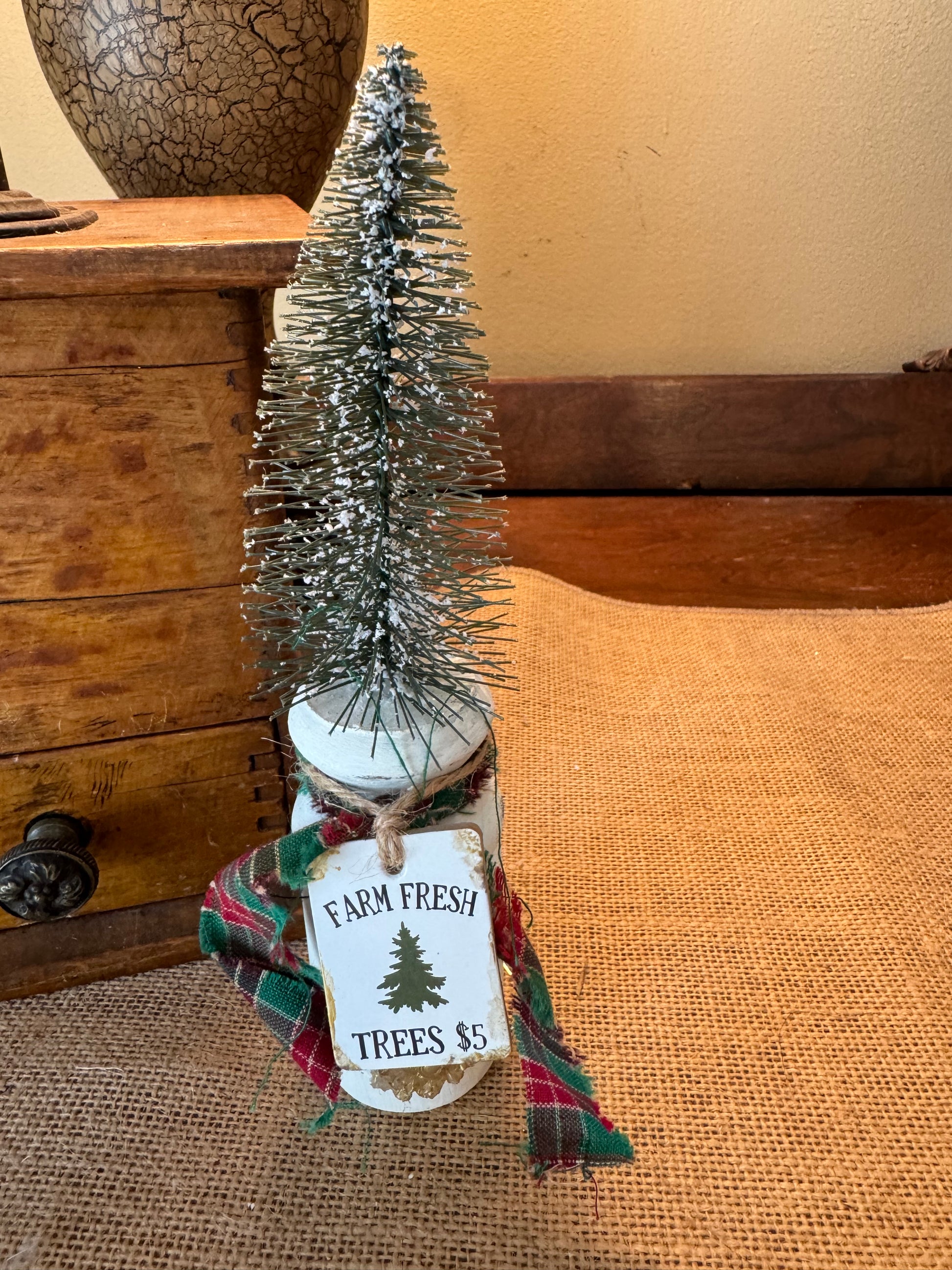 Artfully crafted bottle brush tree atop an old spindle, simple, festive elegance, with "Farm Fresh" 8.5H