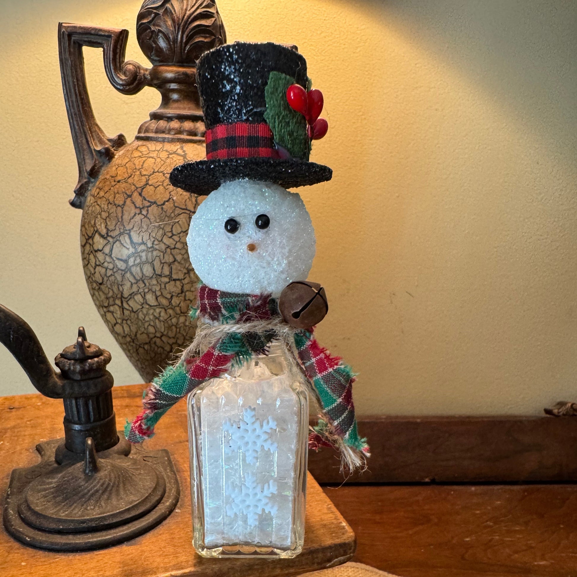 Delightful glass salt shaker snowman-featuring a dapper black hat and festive green plaid scarf for holiday charm. 5.5H