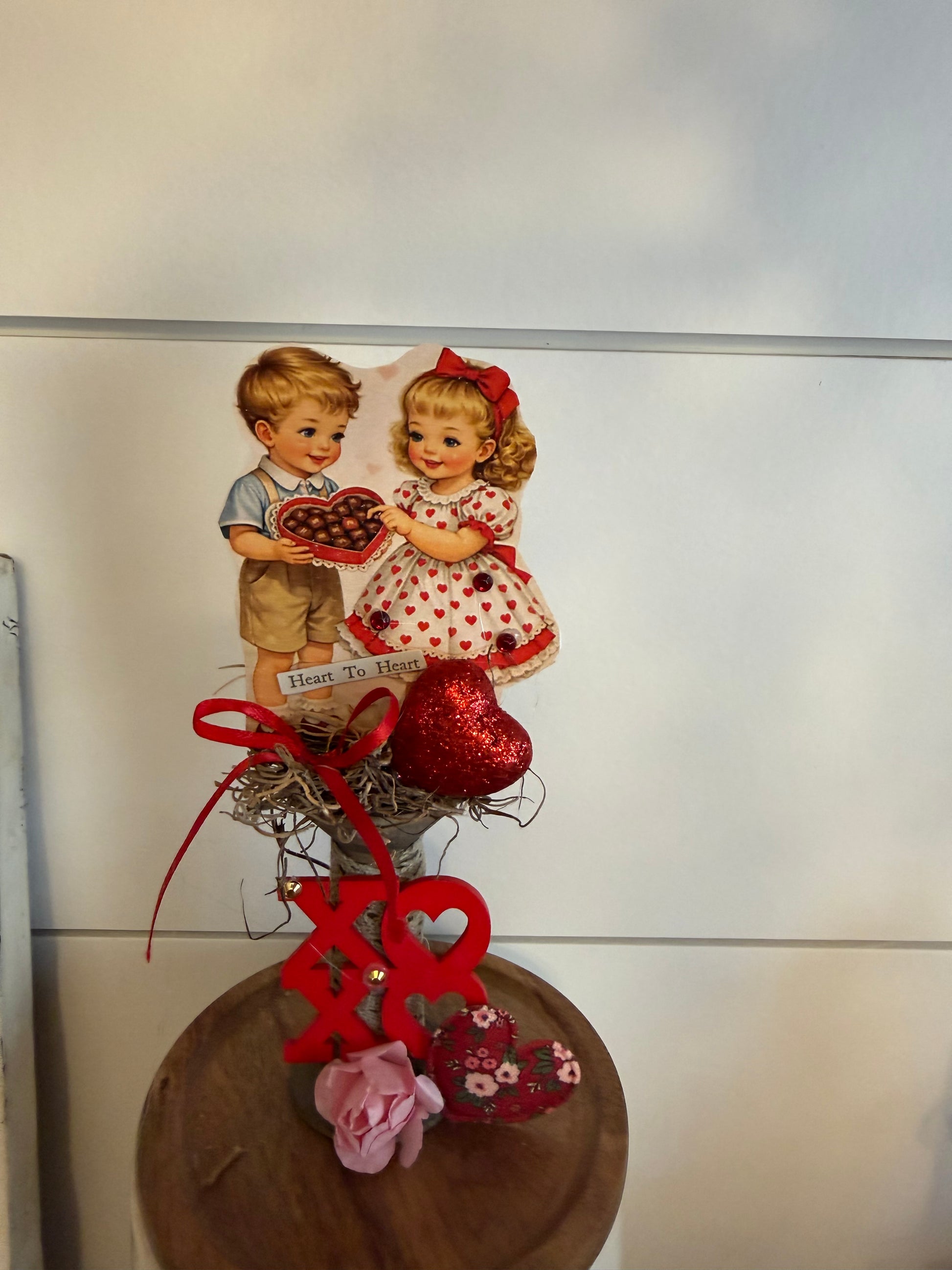 Cute little boy and girl sharing a box of chocolates that has "heart to heart" with red glitter heart and red shoestring bow with xoxo wooden sign and pink sweetheart rose and fabric red floral heart