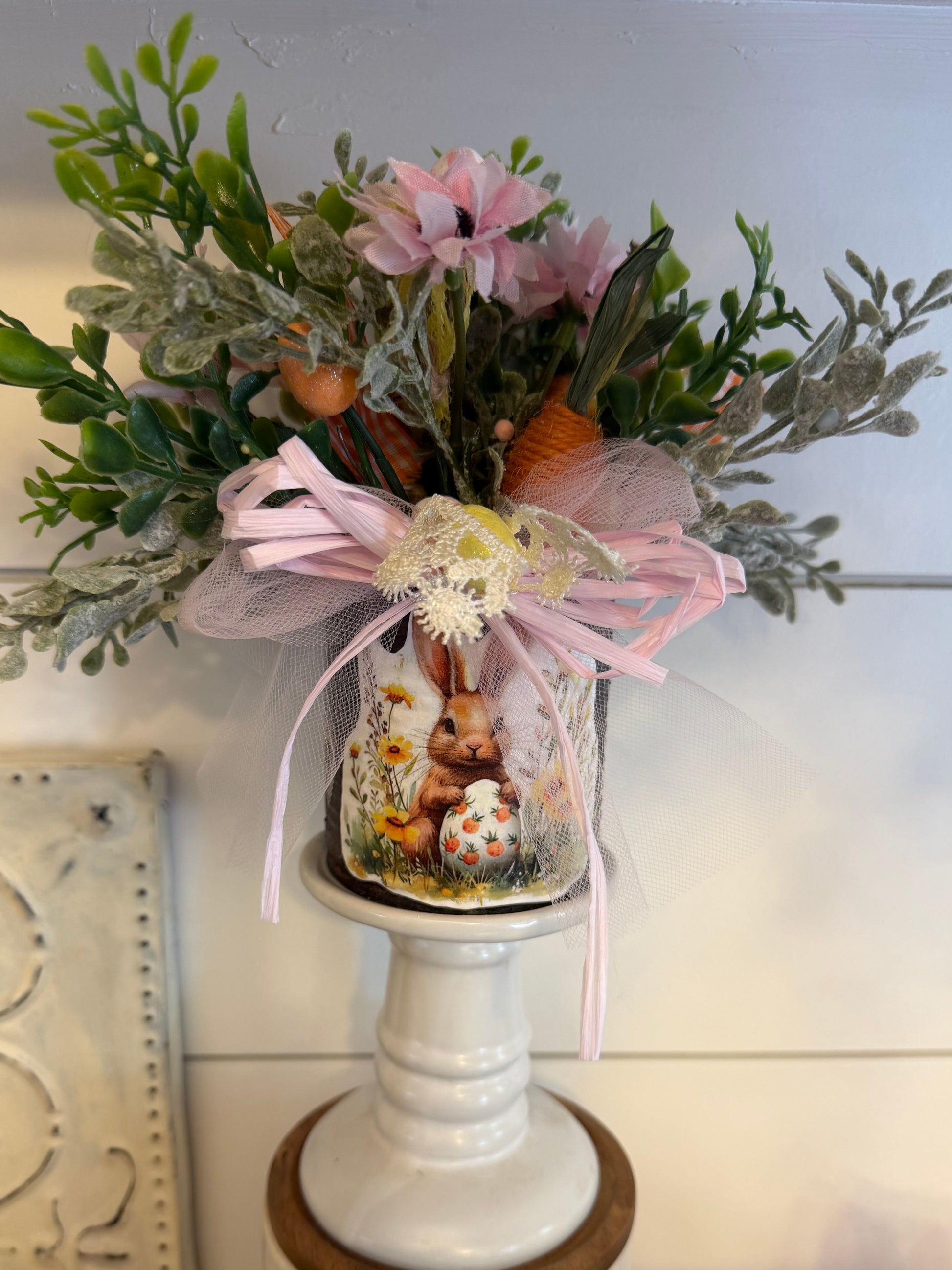 A sweet bunny arrangement made in a recycled evaporate milk can rusted and cute florals with carrots and eggs. Topped off with a sweet pink bow.