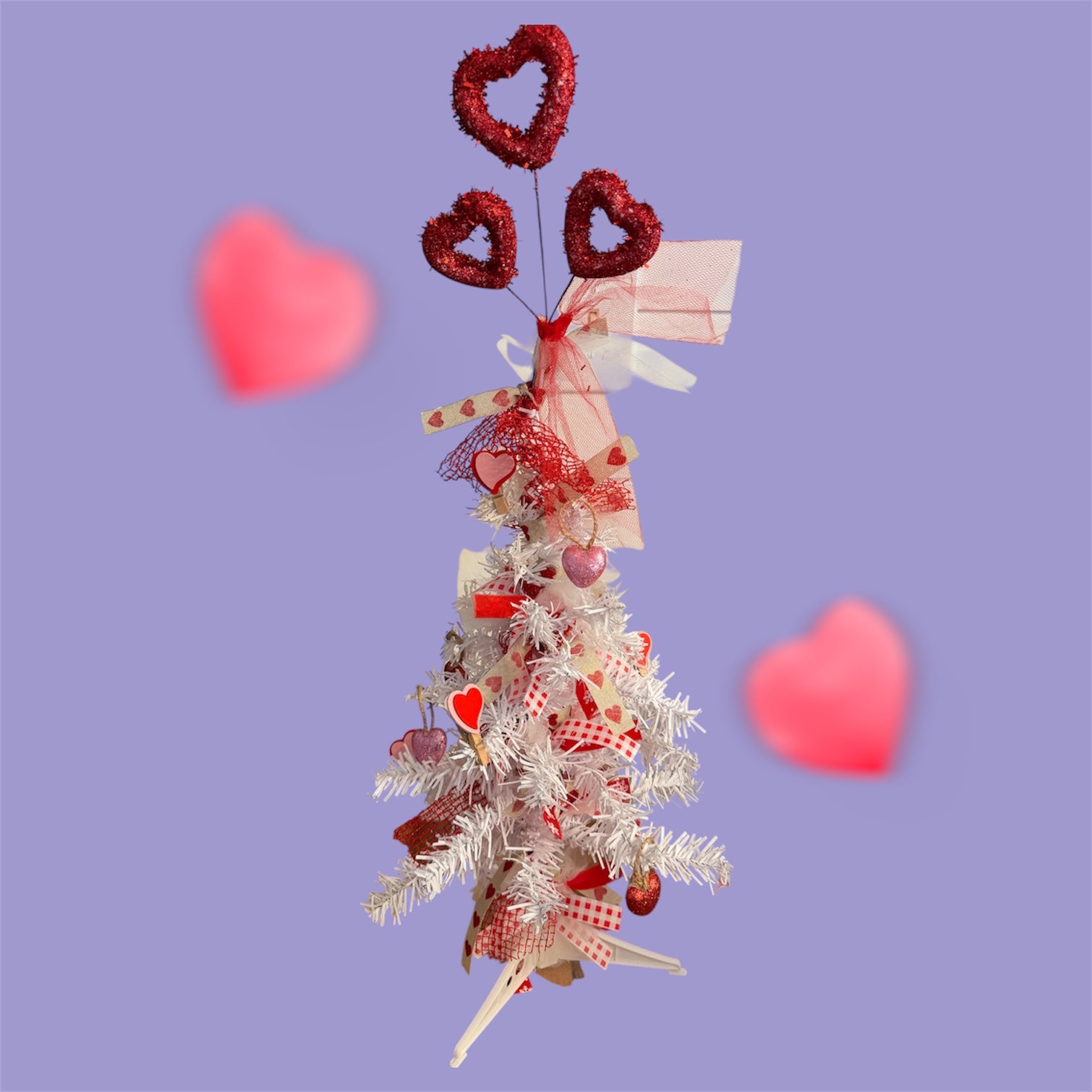 Valentine tree with topper measures 25in H x 8.5in W. Enjoy decoration with this cute Valentine tree with ribbon and heart ornaments.